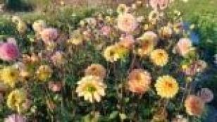 Кроме георгинов разнообразных расцветок, за лето вырастили подсолнухи, гладиолусы, космею, львиный зев, матрикарию и эффектную зелень для букетов.