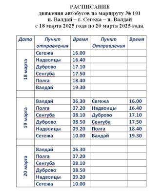 Произошли изменения в расписании движения по пригородному маршруту №101 "г. Сегежа - пос.Валдай - г. Сегежа".