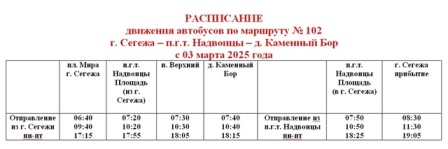 При этом движения автобусов по пригородному маршруту № 102 «г.Сегежа–пгт.Надвоицы–д. Каменный Бор» будет осуществляться в привычном режиме.